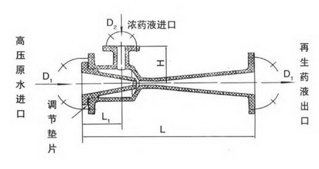高壓原水通過管道閥門]進入噴射器的漸縮段,將靜壓頭轉(zhuǎn)換成動能,在噴嘴處成為高速射流,使混合室形成微真空狀態(tài)將高濃度的再生液吸入混合室,并使再生藥液的壓力和速度發(fā)生變化;在混合段內(nèi),水和藥液得到充分地混合,然后注經(jīng)擴散段,使再生液減低流速,靜壓頭升高,再通過出口管道及閥門將稀再生液送到交換器本體中。